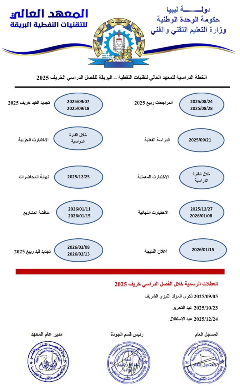 التقنيات الكهريائية_خريف_2025 التقنيات الكيميائية_خريف_2025 التقنيات الميكانيكية_خريف_2025 التقنيات النفطية_خريف_2025 جدول_الحاسب_الالى_رخريف_2025_ سلامة وصحة مهنية_خريف_2025